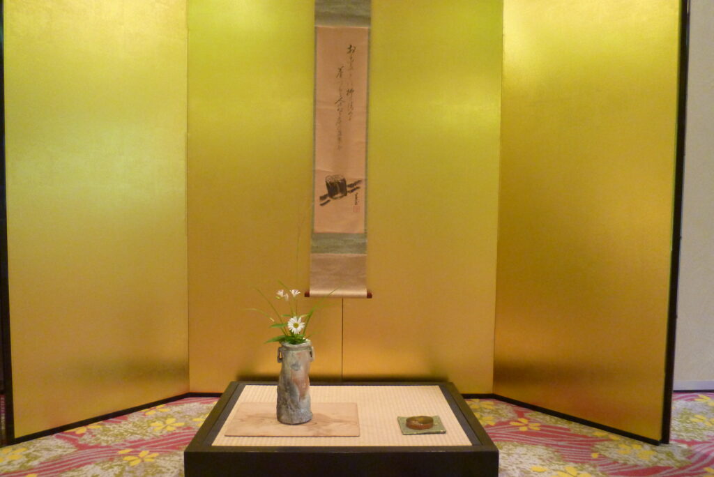 支部担当協賛席の床は淡々斎筆「怠らず 払い清めよ散り積もる・・・」、伊賀の花入れには浜菊、杜鵑、矢筈が入れられ、山里の景色を映したきんとんとお薄をお楽しみいただきました。