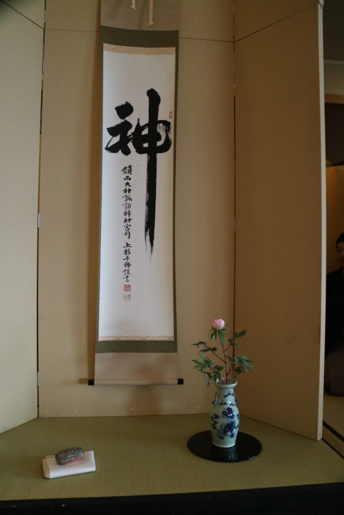 濃茶席の掛物は長崎諏訪神社 上杉千郷宮司筆の「神」、床には染付花入に入れた牡丹、湖東焼の振々香合を飾り、紹鴎棚を据えてお濃茶を練りました。