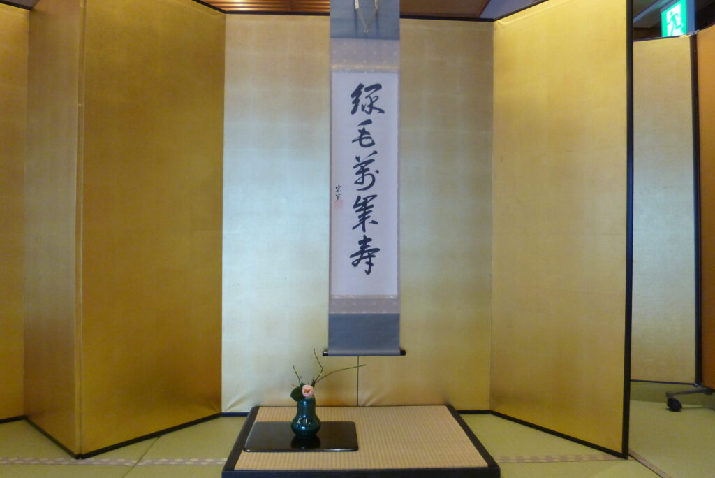 薄茶席は立礼席で、掛物は坐忘斎御家元筆の「緑毛萬年寿」、永楽作の緑交趾に曙椿と白梅が入れられました。